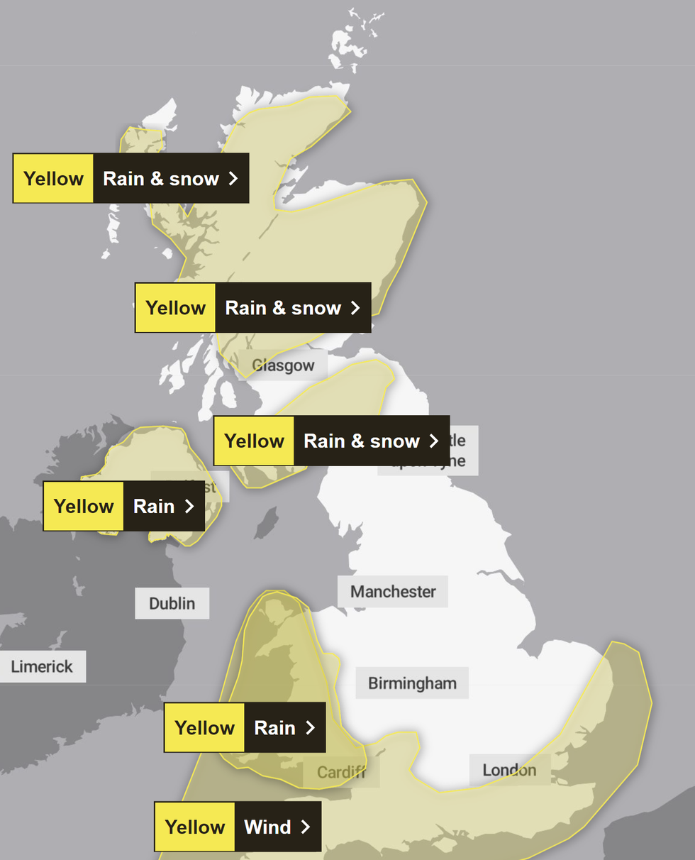 Meanwhile, there are yellow warnings for rain for the majority of Wales and Northern Ireland. A yellow warning for wind is in place through all of Saturday across the majority of the English south coast and in East Anglia.