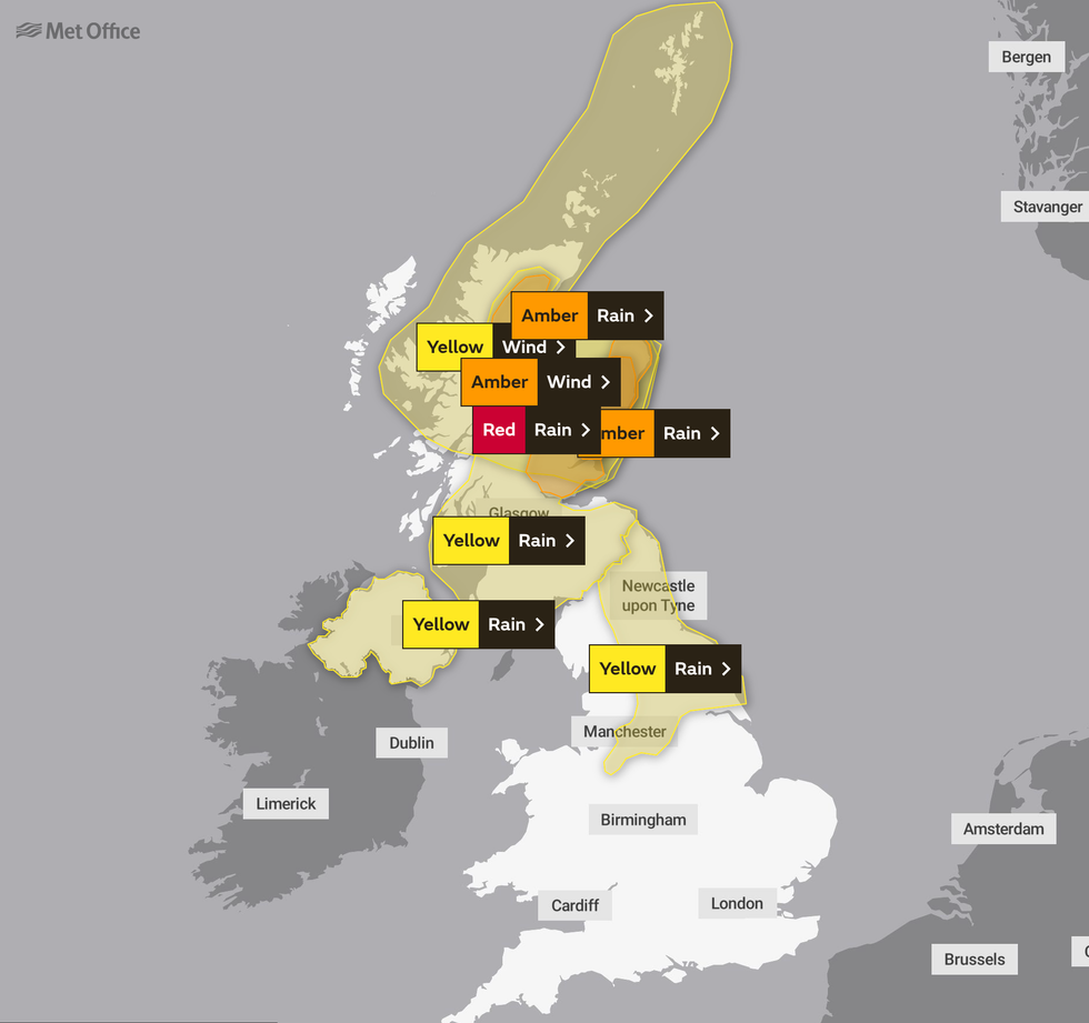 A series of weather warnings are in place, including a red warning issued for "exceptional rainfall and impactful wind" in the east of Scotland.