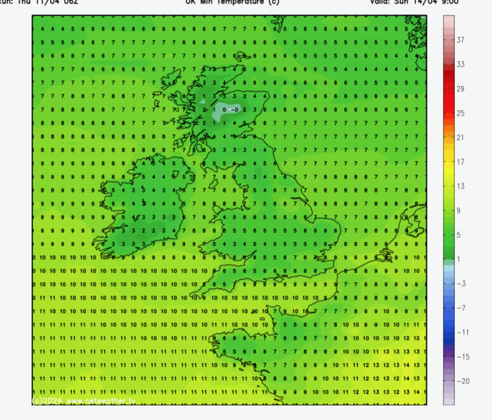 Lows of freezing could hit the high spots of Scotland and northern England while the rest of Britain sinks to single figures.
