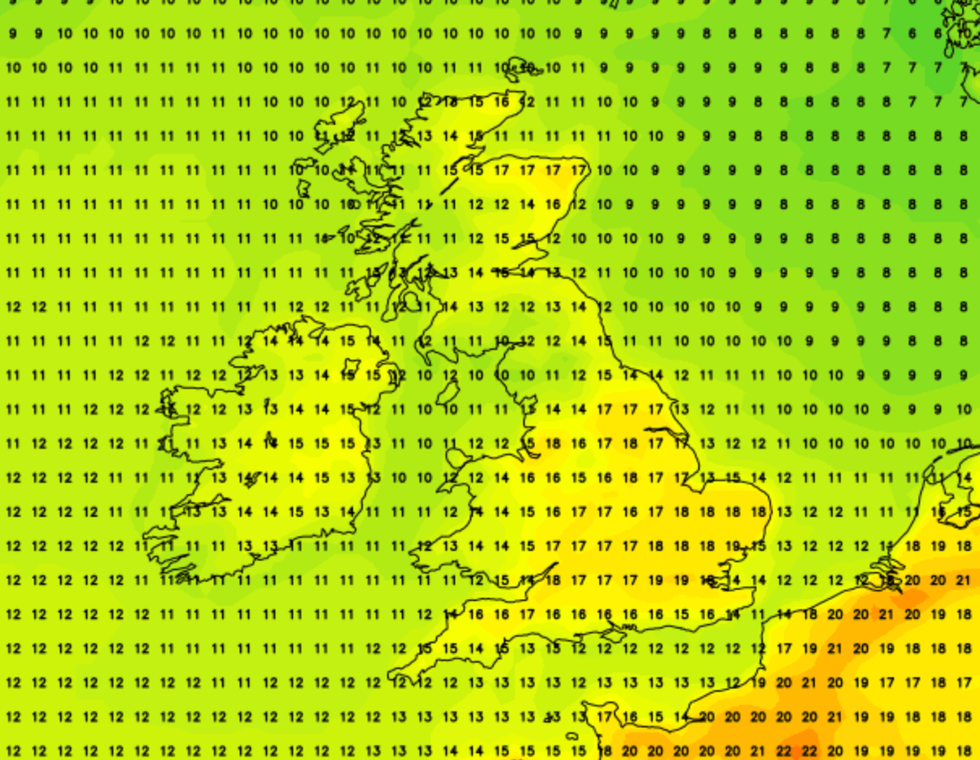 The latest forecast suggests a rush of "spring heat" will see temperatures reaching 19 to 20C in southern areas of the UK.