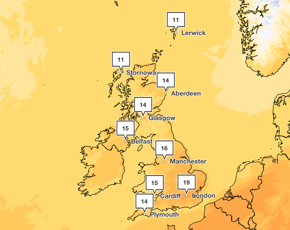 A spokesperson said: "Rather cloudy with patchy rain in the north, though brighter across the far northeast of Scotland. England and Wales mostly dry with warm sunshine, but cloudier in the far west.