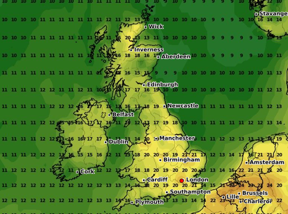 In the Midlands, conditions are predicted to be between 20C and 22C.