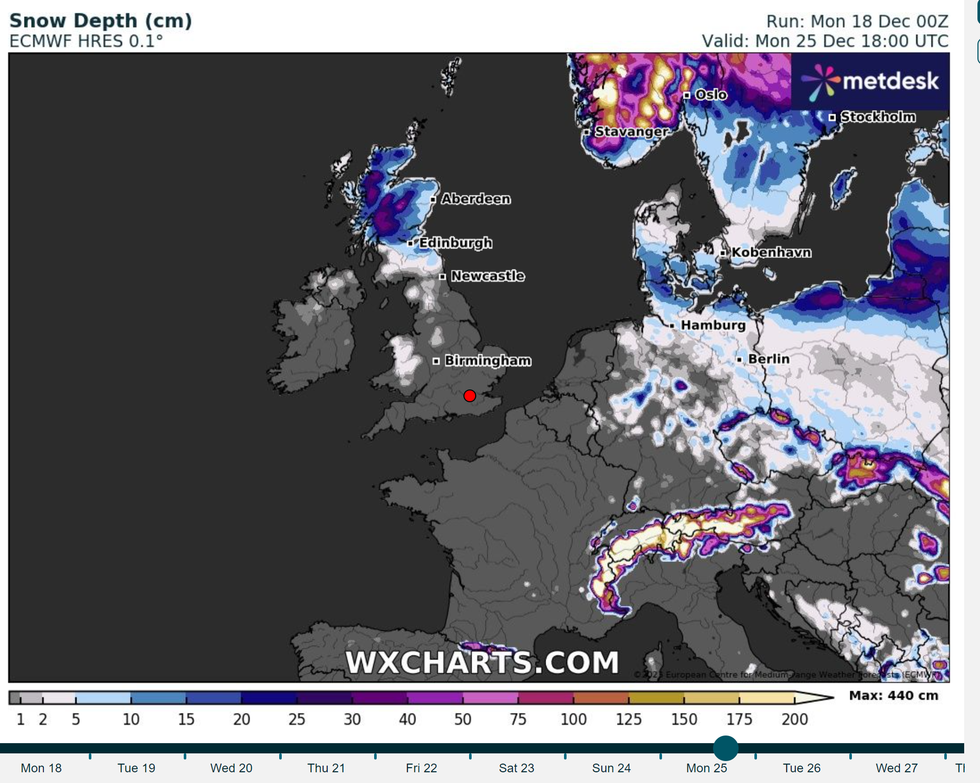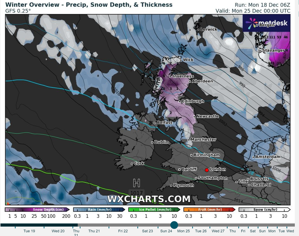 Aside from the snow, some hilly areas in the far north of Scotland could wake up to lows of -10C on Christmas Day.