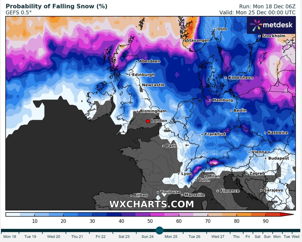 According to WX Charts weather forecast, there is also a high probability of snow in Wales and across the Lake District.