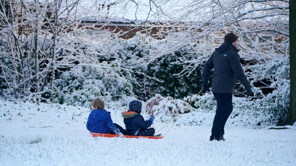 A man pulls two children through the snow on a sledge at Camp Hill in Woolton, Liverpool.
