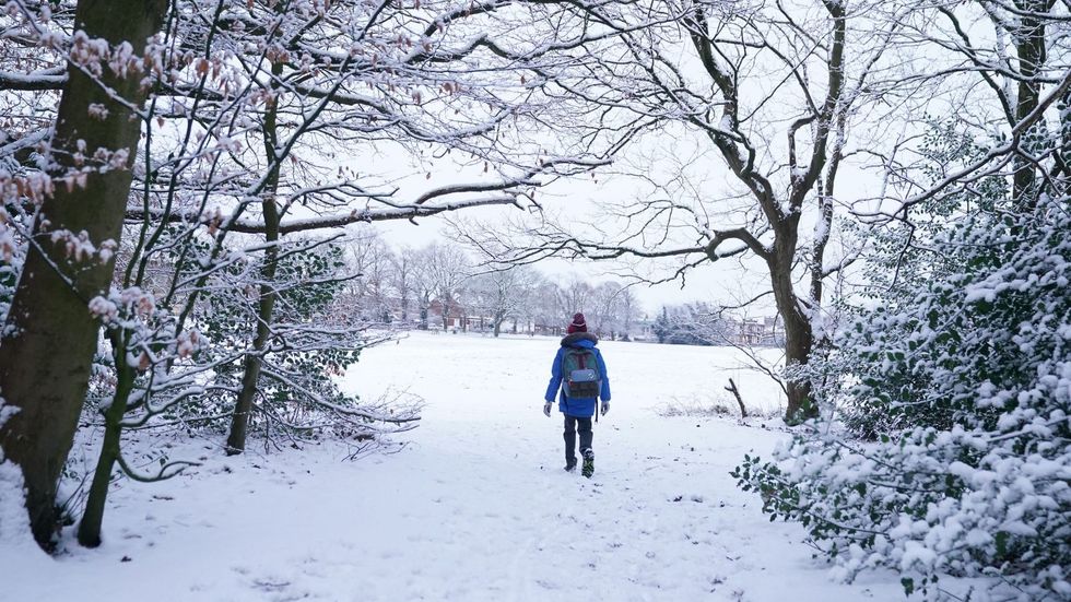 A person walks through the snow on Knutsford Heath in Cheshire as temperatures plunge to sub-zero