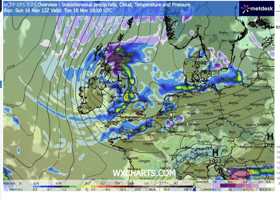 In tandem, a low-pressure cyclone to the northwest will sweep a band of rain in from the Atlantic.