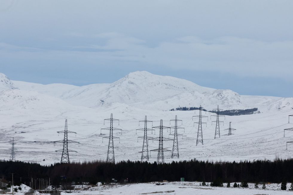 Electricity pylons stand in snow, with Scotland in the grip of a deep freeze following Storm Goretti