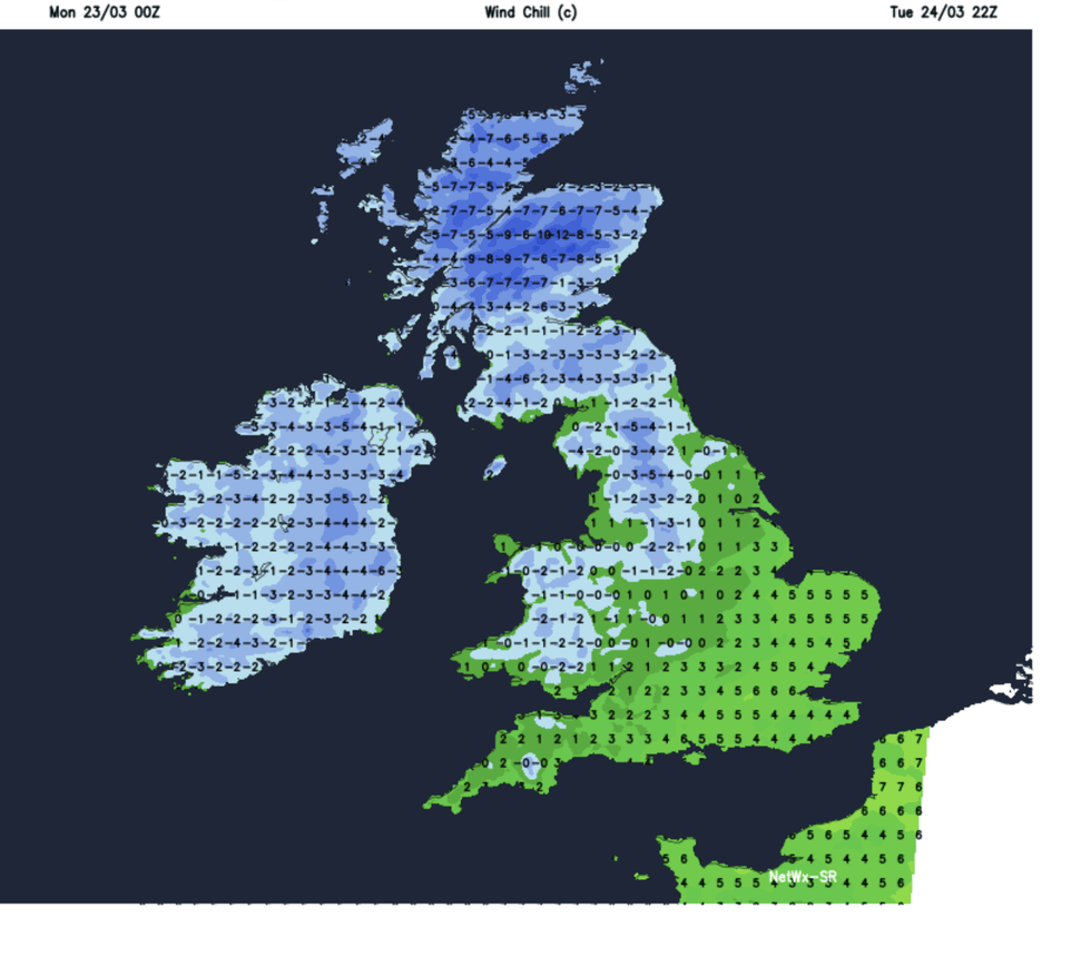 Temperatures in rural spots to the north will drop to minus 5C, he warned, with wind-chill making it feel even colder.