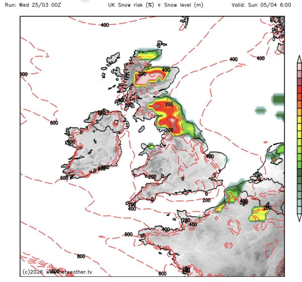 Snow charts show the risk of wintry downpours across Scotland and parts of northern England.