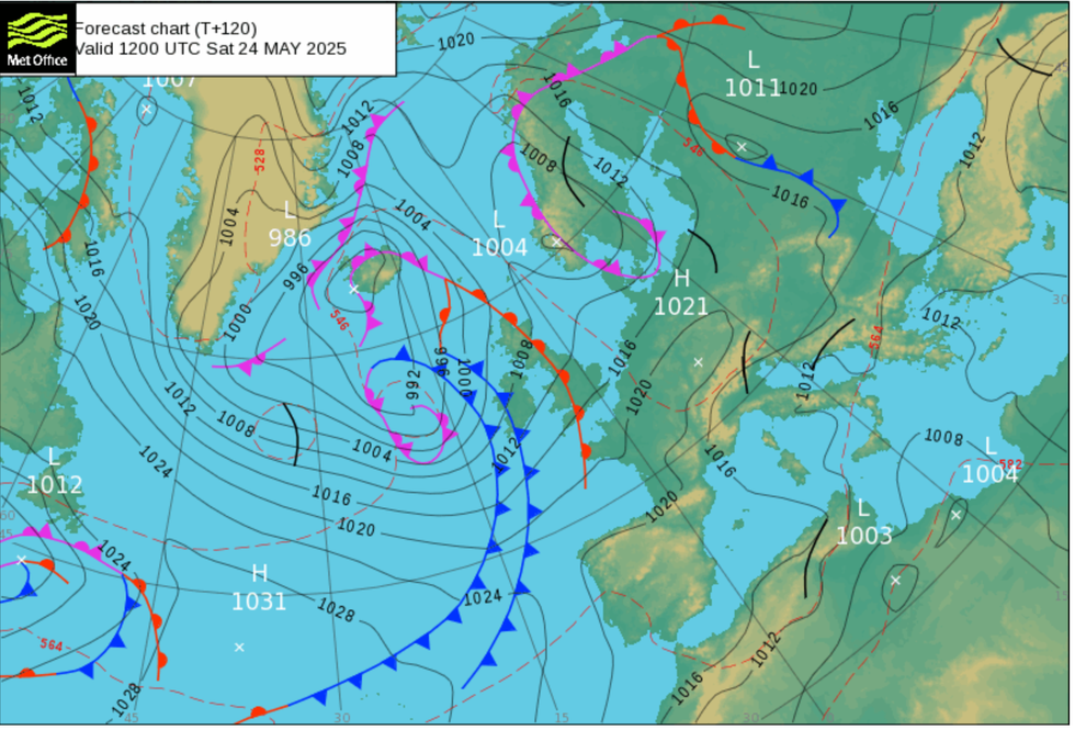 A double-tailed cold front about to scour Britain will usher Polar winds and plummeting temperatures for the start of summer.