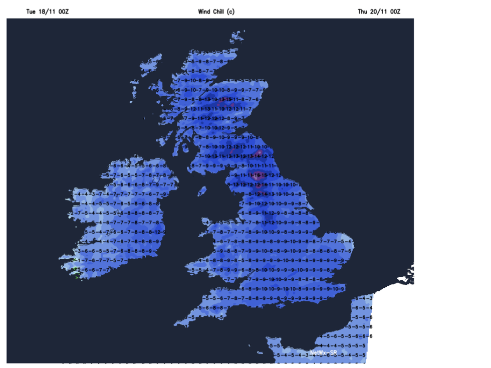 “Overnight, temperatures could fall to minus ten, with a significant wind chill from a strong northerly wind making things feel even colder.