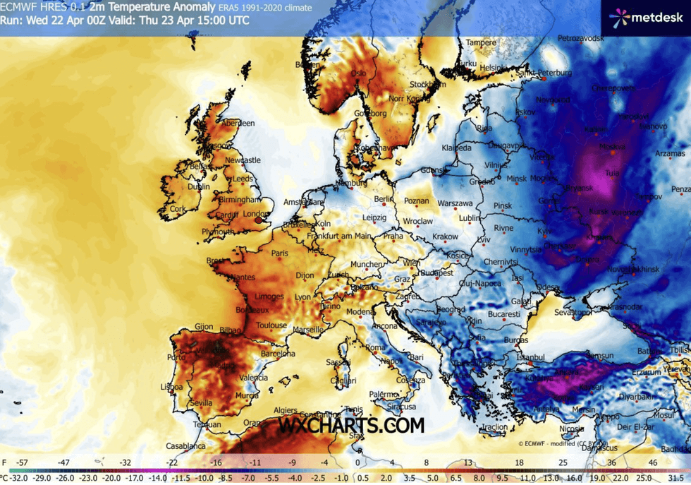 Low humidity is forecast through the end of April thanks to an unusual ‘Omega Block’ – a pattern of pressure with high pressure and low pressure straddled on weather charts to resemble the Greek letter – dragging winds over the Continent.
