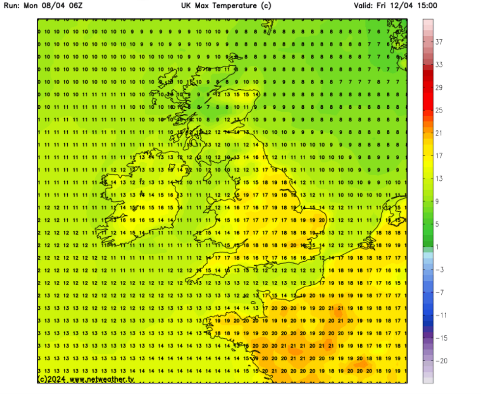On April 12, highs in the twenties will be felt in the South and South East, with those in London, Norwich and Cambridge enjoying a particularly pleasant start to the weekend.