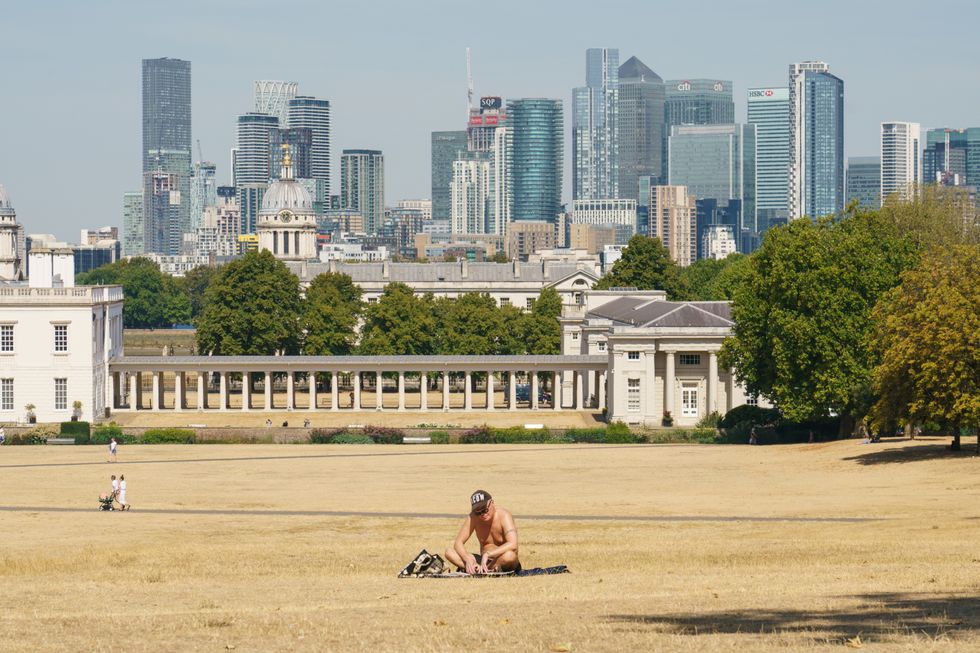 A man sunbathes in a nearly empty Greenwich Park, London, as a drought has been declared for parts of England following the driest summer for 50 years, taken on August 14, 2022.