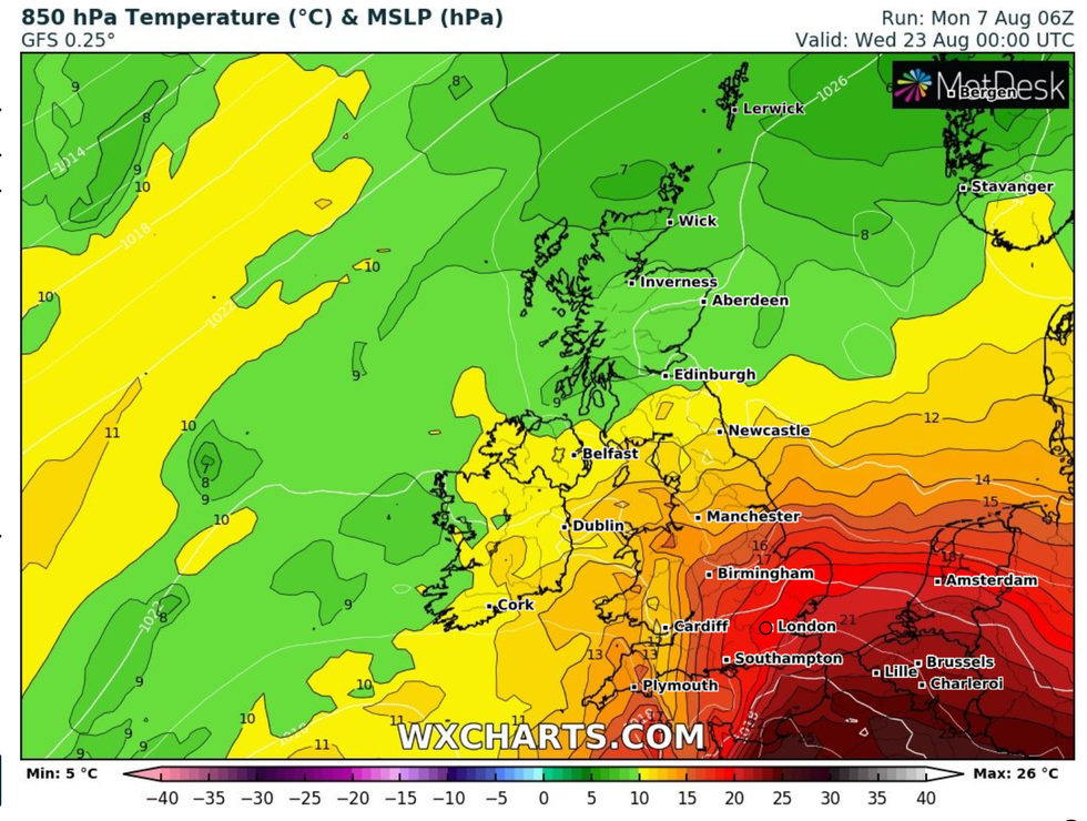 According to new weather maps, pockets of fair weather will break out over the UK on Wednesday 16 August, with highs of 26C expected in some southern areas.