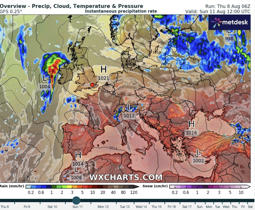 “Heat will ease as we head into Tuesday, and then we will see a spell of wet weather push across the country we will also see a spell of thunderstorms develop quite widely on Sunday, Monday and into Tuesday.”
