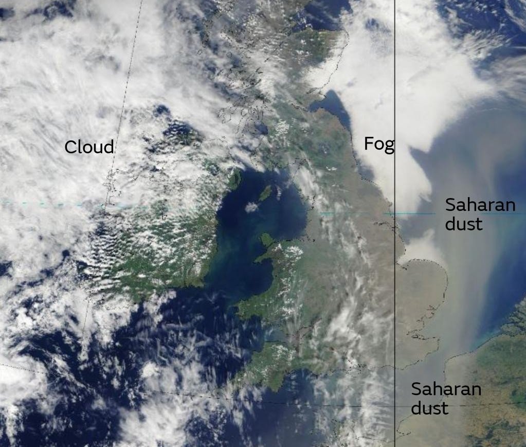 Sand clouds from the Sahara desert have filled British skies as unseasonably high temperatures beat down on the UK