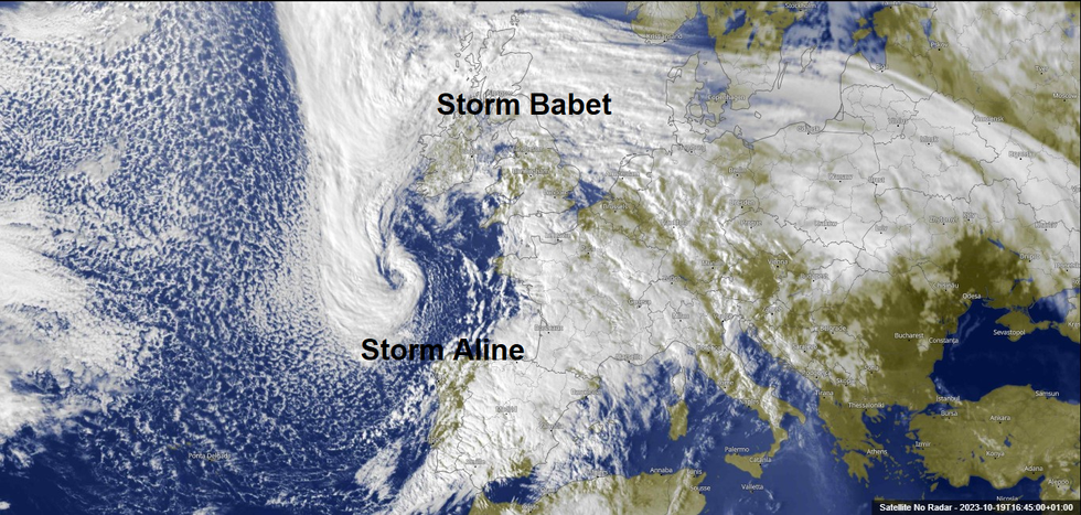 The low pressure has been named by the Spanish Met Service as Storm Aline and is on track to move across western France later today and is set to push torrential rain up into the south of England.