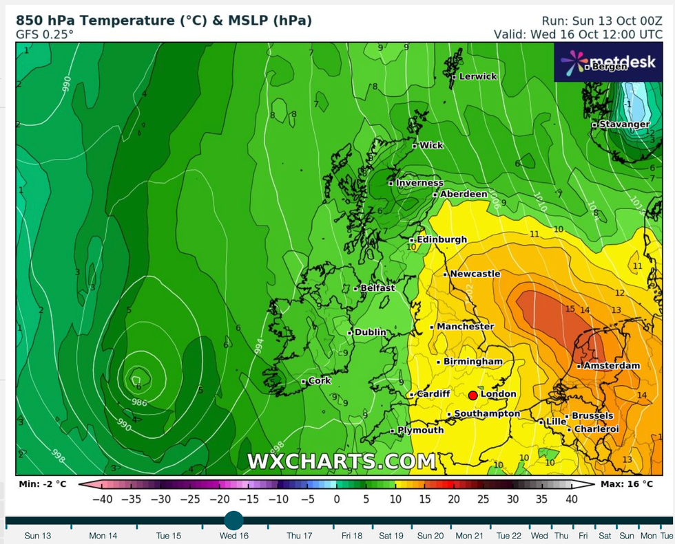 "There is potential for parts of England and Wales to see overnight minima of 14 to 16C overnight Wednesday/Thursday, which is close to what these regions would normally expect to see as a daytime maximum around mid-October."