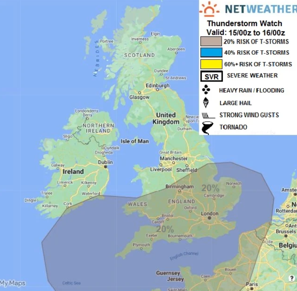 Heavy showers and thunderstorms could batter the south of England generating lightning strikes and brief intense rainfall