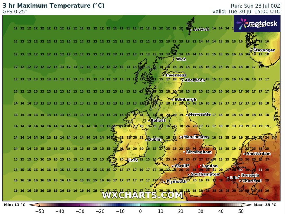 Writing on Facebook, Madden said: “There is no reason as to why we won't see top temperatures in and around the mid-30Cs developing in parts across the southern half of the country during the peak of this.”