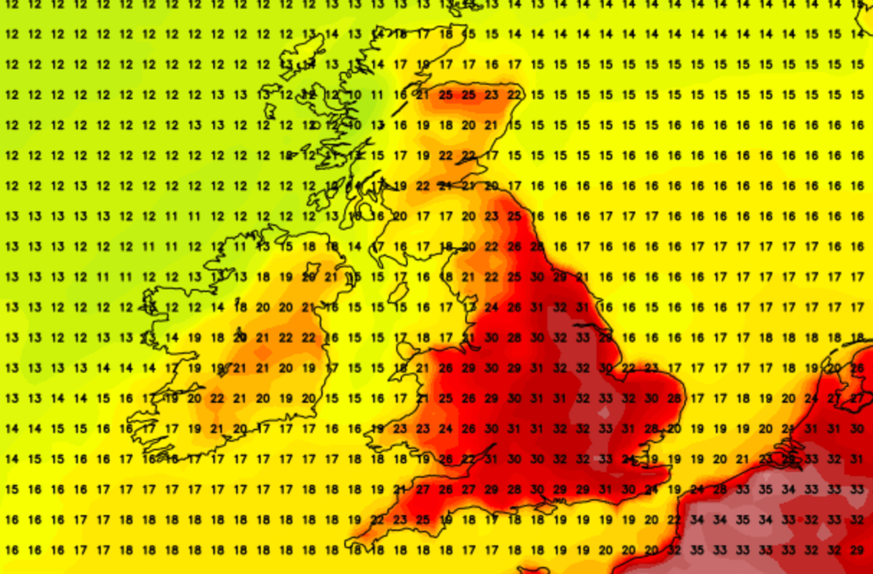 “Although Monday in many places will be the peak of this heatwave, it is not going to be a heatwave everywhere, and there will be outbreaks of rain and more cloud towards the far northwest of the UK while many other places see those temperatures soaring into the low- to possibly mid-30Cs.