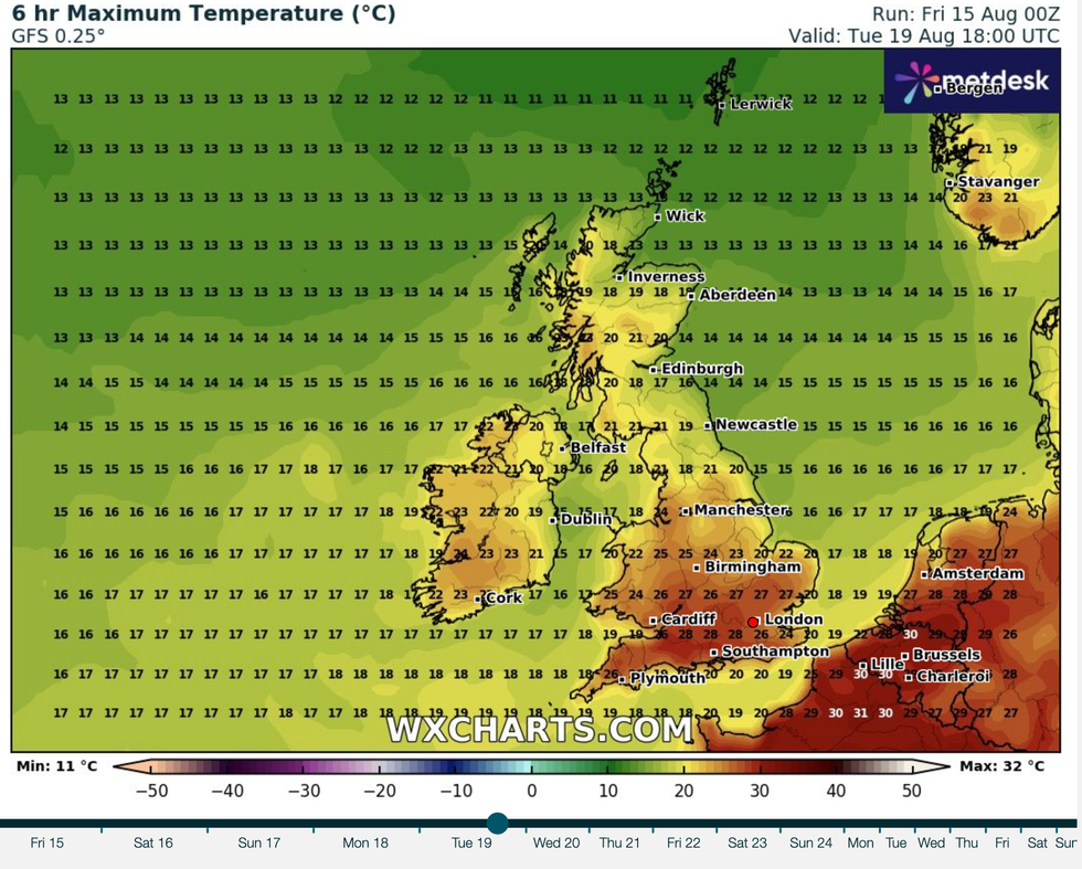 “Temperatures are starting to increase once more on Friday, with highs reaching 31C in London and widely reaching into the mid- to high-20C elsewhere, but a little cooler in Scotland and Northern Ireland.