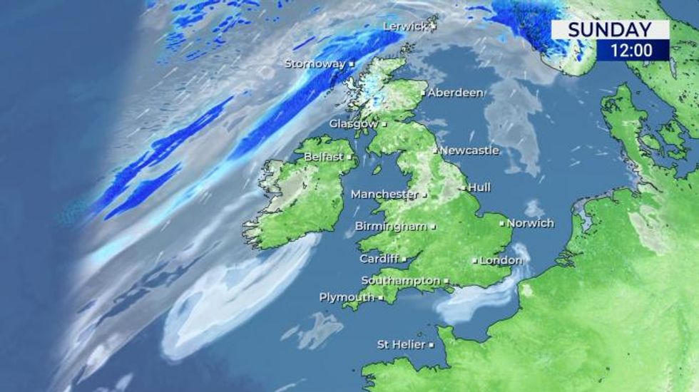 It will be rather cloudy in the northwest and far north with some rain or drizzle, turning heavier in northwest Scotland later. Elsewhere, a dry day with sunny periods and becoming very warm inland.