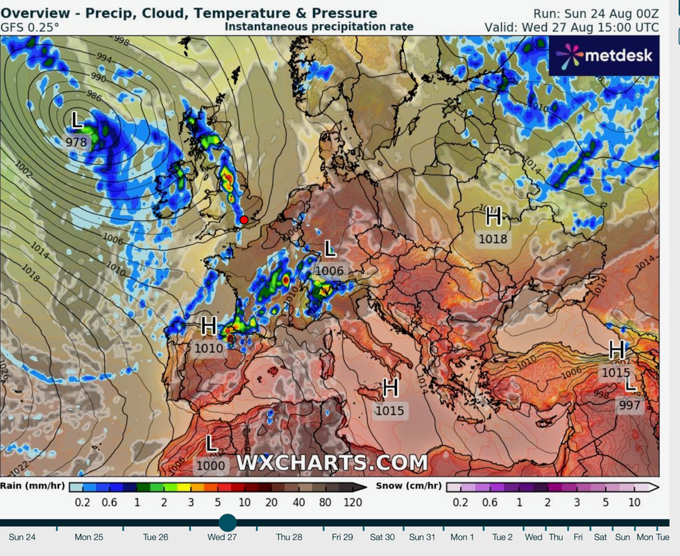 “It is not going to be super-hot, but temperatures will rise through the long weekend, but we will then feel the influence of Erin towards the middle part of the week, and there is a band of rain coming through on Tuesday and Wednesday, and then more widely a wetter day.