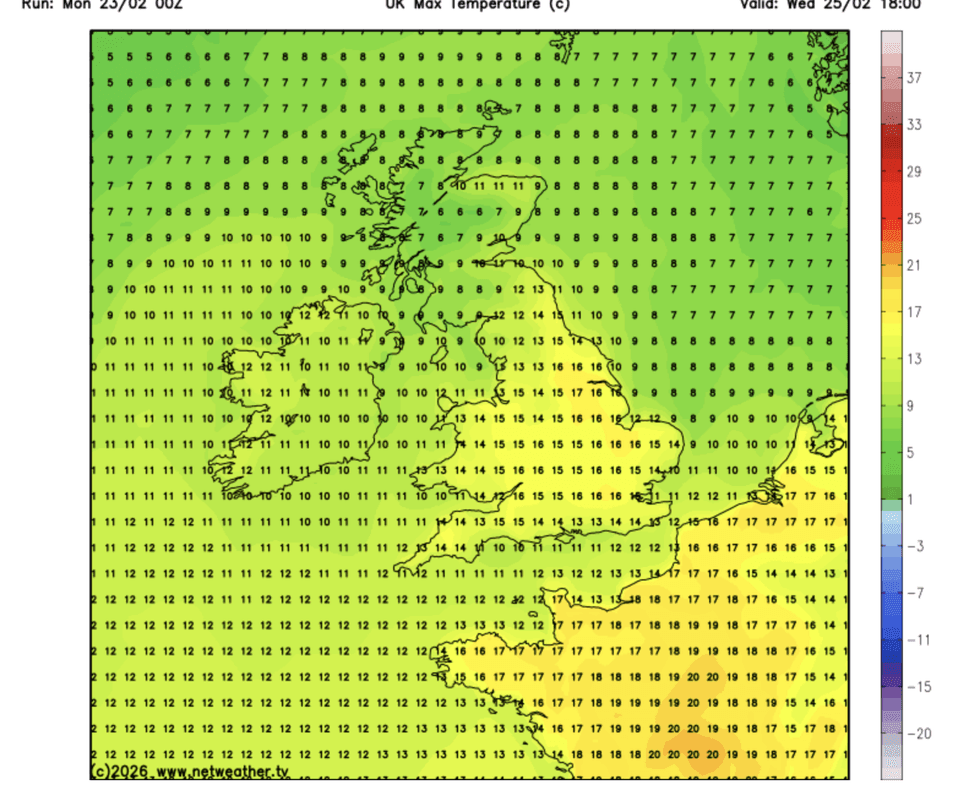 “It turns even milder on Wednesday as we drag in very mild air from the south, and we could see highs of 17C or 18C in the southeast.