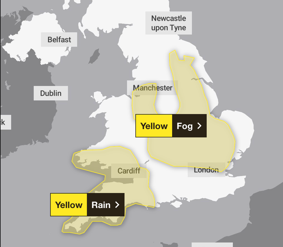 Yellow warnings of fog and rain will cover large areas of the country, meaning trains, buses and flights are likely to be affected.