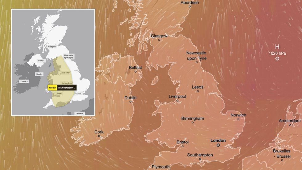Britons are set to bathe in sizzling temperatures this weekend as Met Office forecasters predict highs of 27C - before thunderstorms and heavy downpours strike the UK | Met Office/ VentuskyThe warning spreads across a wide range of the UK from the Scottish border down to the south coast.